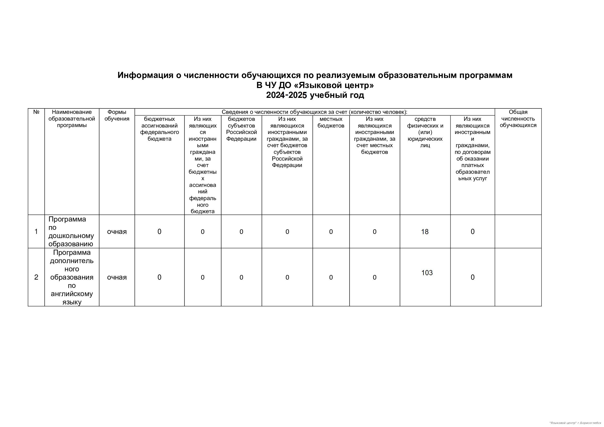 Частное учреждение дополнительного образования «Языковой центр по изучению иностранных языков» осуществляет образовательную деятельность по дополнительным образовательным программам: Программа дополнительного образования по английскому языку Программа по дошкольному образованию Программа дополнительного образования по английскому языку является многоступенчатым проектом языковой подготовки, реализующим идею целостной образовательной среды для учащихся начальной, основной и старшей школы в рамках системы дополнительного образования. Обучение в Учреждении ведется на русском языке, кроме того, обучение может проводиться и на иностранных языках, которые изучаются в рамках образовательных программ. Форма обучения: очная. Возраст обучающихся: дети от шести лет и старше, взрослые без ограничения возраста. Продолжительность обучения регламентируется договором об оказании платных услуг и соответствующей программой обучения, и может варьироваться от 1 недели до 10-ти месяцев. В настоящее время объем образовательной деятельности по договорам об оказании образовательных услуг за счет средств физических и (или) юридических лиц составляет 100%. Выписка из реестра лицензий на осуществление образовательной деятельности Численность обучающихся по реализуемым образовательным программам Положение об электронном обучении и использовании дистанционных образовательных технологий Перечень печатных и электронных образовательных и информационных ресурсов Рабочая программа "Развитие речи и обучение грамоте" (младшая группа) Рабочая программа "Обучение грамоте" (средняя и старшая группы) Рабочая программа "Математика и конструирование" (младшая группа) Рабочая программа "Математика и конструирование" (средняя и старшая группа) Рабочая программа "Английский язык" Рабочая программа "Кукольный театр" Рабочая программа "Окружающий мир" Рабочая программа "Художественно-эстетическое развитие" План учебно-воспитательной работы на 2025-2026 учебный год